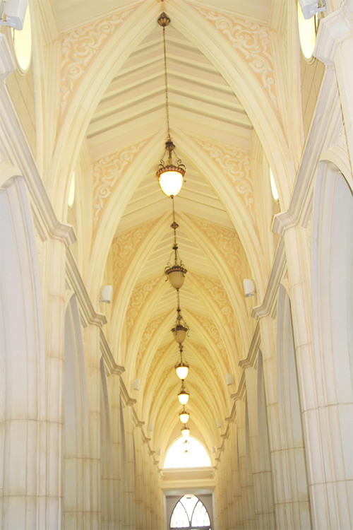 大型方柱、装饰线、花饰拱板、格栅式窗套堆砌而成的具有半椭圆穹顶的正厅和敦实厚重、均衡安稳的二侧长廊,在摇曳的灯光下尽显高贵奢华,让游客仿佛置身于童话世界。城堡中心由五根收分圆柱高高地撑起二层五面体屋顶,层层的装饰板烘托出城堡的恢宏气势。